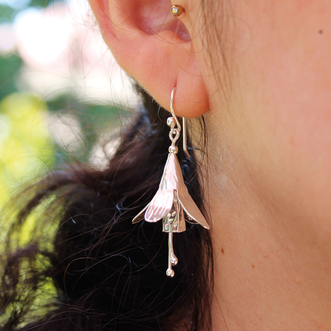 Inspirados en la delicadeza del chilco, flor nativa del sur de Chile, estos aros de plata celebran la conexión profunda con la naturaleza. Cada pieza está hecha completamente a mano en plata 950, cuidando cada detalle para capturar la forma colgante y elegante de esta flor silvestre.